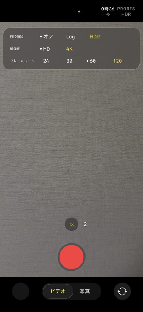 ProResが有効になっている場合は、カメラで「ビデオ」を選ぶと、以前のバージョンだと左上のフラッシュのアイコンの横にある「ProRes」をタップして有効にするだけだった。しかし、「iOS 26.2(23C55)」ではカメラの画面で解像度やフレームレートも設定できる手順が1つ増えている。