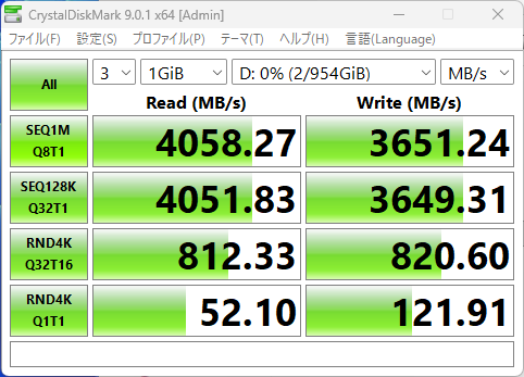 NX-P4MGはUSB4に対応し、最大シーケンシャルリードは4000MB/s、NX-P4MG1TBの最大シーケンシャルライトが3500MB/s(2TB以降は3600MB/s)となっている。では、実際はどうなのかストレージの速度計測で定番の「CrystalDiskMark 9.0.1」を使って、速度を計測してみた。