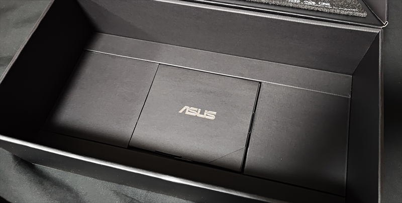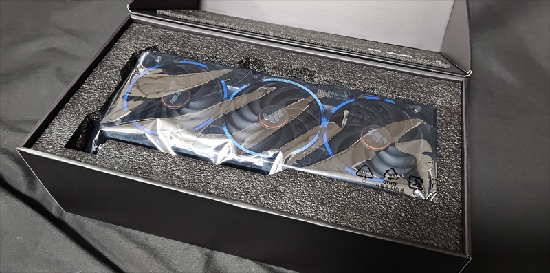 まずは箱の中身を確認したい。箱を開けるとビデオカードが入っていて、その下にTUFの信頼証明書や、マニュアル、ゲームの引き換え手順書(英語)などが入っている。