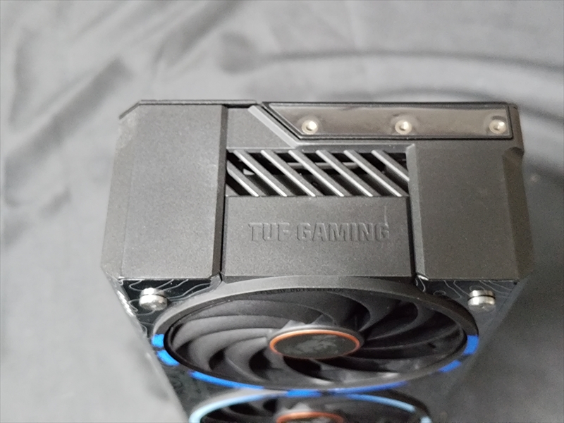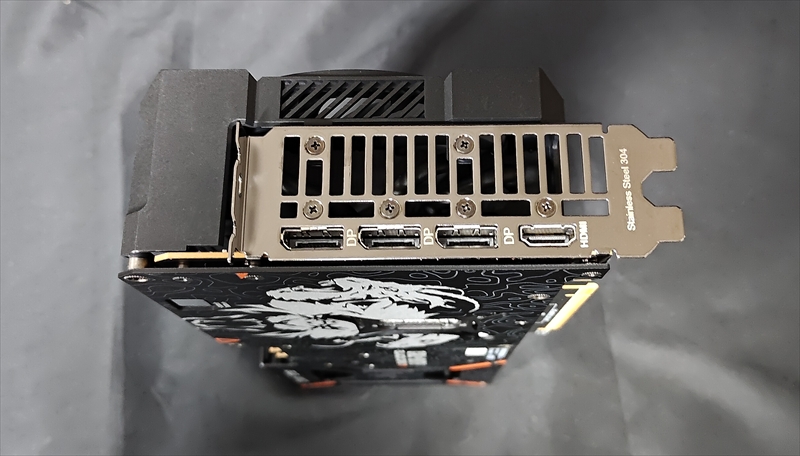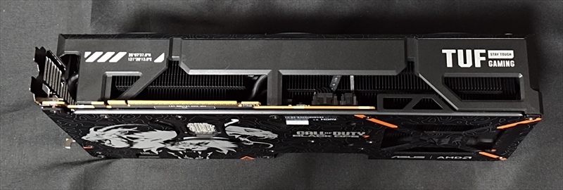 カバーの上部や右側は、特に特別な模様などは描かれていない。ブラケットも普通で、インターフェースも「TUF Gaming Radeon RX 9070 XT OC Edition 16GB GDDR6」と同じ、DisplayPort 2.1a×3、HDMI 2.1b×1となっている。