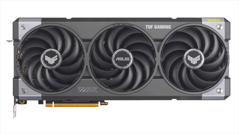 本体のベースは同社の「TUF Gaming Radeon RX 9070 XT OC Edition 16GB GDDR6」だが、3連ファンの左右の周りは青を取り入れ、中央は白を取り込んで、そこに削りの模様も加えた、ミリタリー調に色のアクセントを加えたデザインに。