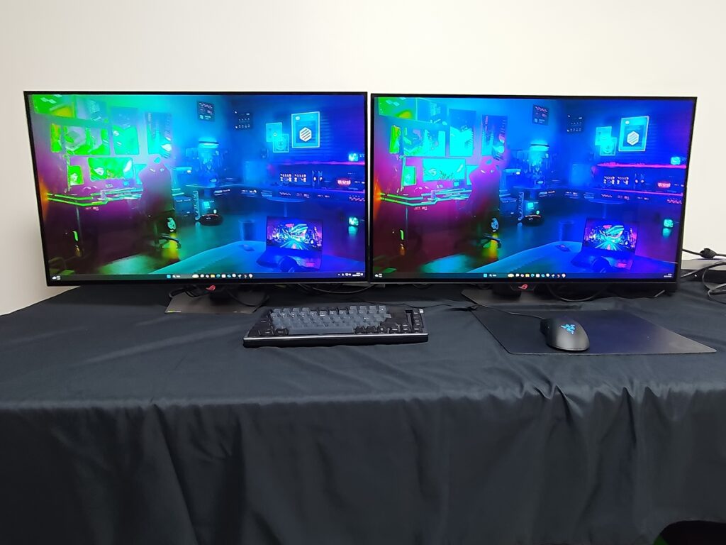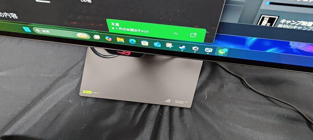 近接センサーで席を離れたら自動で画面が消え、戻ったら画面が表示される機能など、有機ELの焼き付け問題を低減させる機能も多数搭載。従来のROGのゲーミングディスプレイは、V字型で奥行が割と必要なスタンドを採用していた製品もあったが、シンプルでコンパクトな台座に。