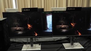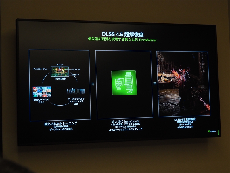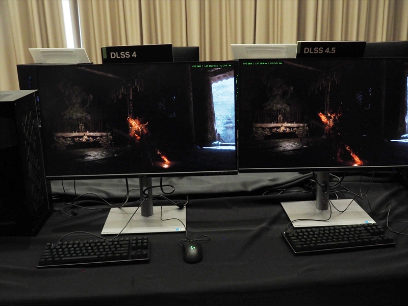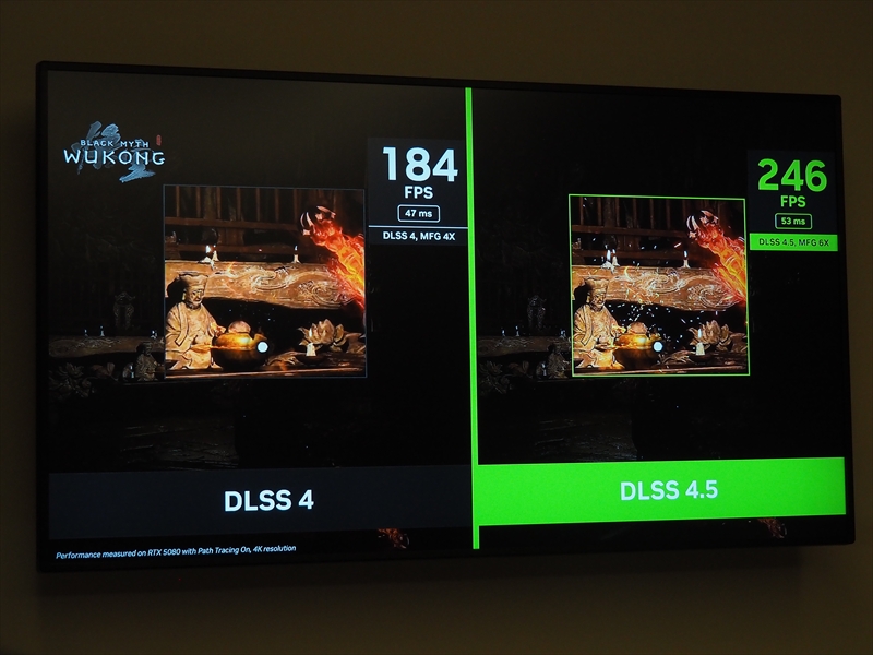 実際に会場では、『黒神話:悟空』を使ったDLSS 4とDLSS 4.5の比較デモが置かれていた。遠目だと分かり辛いが、たとえば香炉から漏れる光りの粒子が、DLSS 4だとあまり表現されていないが、DLSS 4.5だと明らかに増加し、細かな表現が向上している。