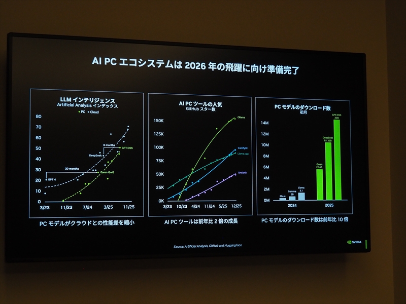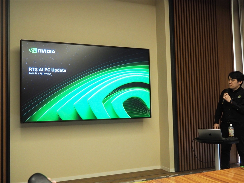 NVIDIAは、都内・某所にて「RTX AI PC メディア向け説明会&デモ体験会」を実施した。本説明会では、1月6日より米・ラスベガスで行われたCES2026にて、同社が発表したばかりの最新AIテクノロジを取り入れたゲーミングデモや、AI愛好家の日常の生産性を向上し、制作活動を高速化する最新のAIモデルを活用したRTX AI PCのデモが見られた。