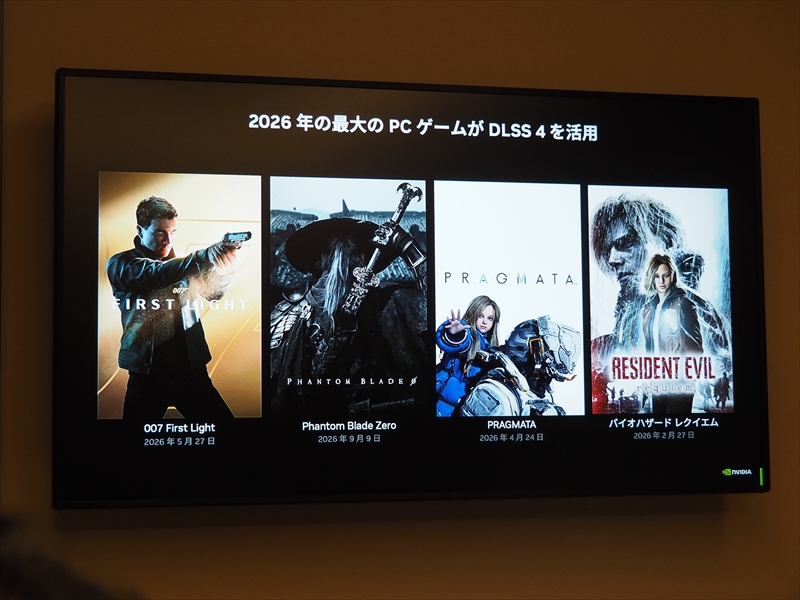 また、既存のDLSS 4は250以上のPCゲームで使用され、2025年の人気トップ20のゲームの80%がDLSS 4を採用している。2026年も『007 First Light』や『Phantom Blade Zero』、『PRAGMATA』、『バイオハザード レクイエム』といった最新タイトルで採用される予定としている。