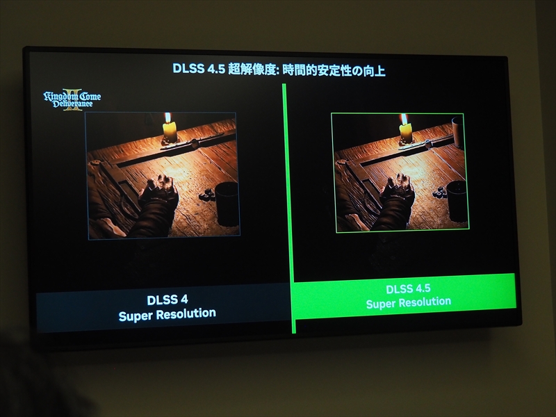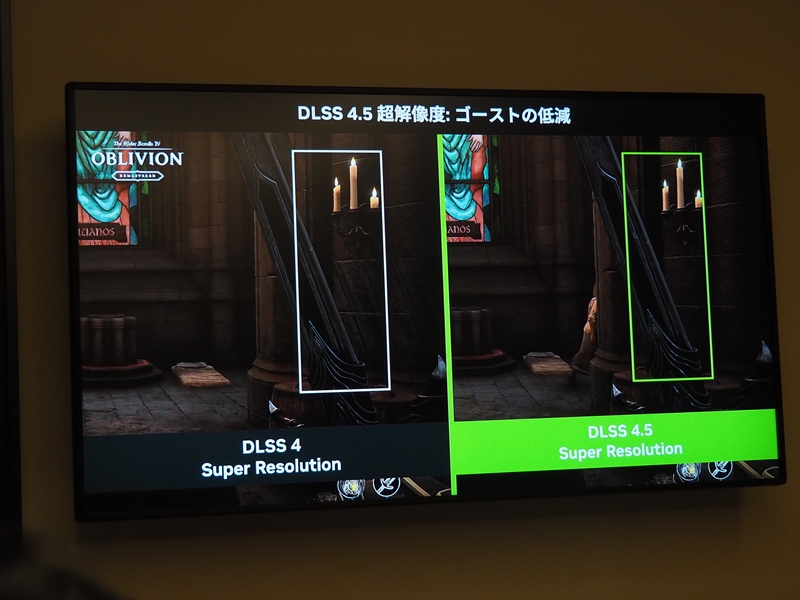 実際に『Kingdom Come: Deliverance II』の映像で比較すると、テーブルの上の映像のちらつきが解消し、より安定した映像を保っているという。また、『The Elder Scrolls IV: Oblivion Remastered』では、従来は動きが速いシーンだとゴーストが発生しているが、DLSS 4.5では非常に滑らかで、エッジが鮮明になっているとのこと。