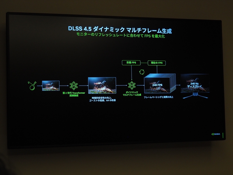 一方、負荷が軽いシーンでは、フレームの生成数を減らして、必要な計算のみを行える。それにより、画質が上がり、表現が向上する。ダイナミックフレーム生成では、240fpsと目標フレームレートを指定すると、フレーム生成数が調整され、安定したフレームレートでゲームがプレイできると語った。