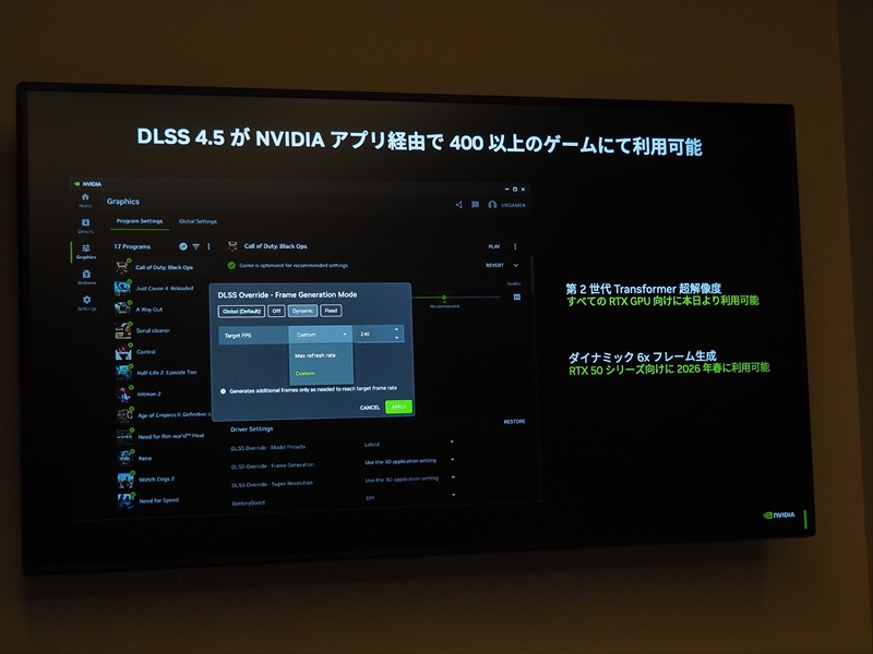 現在、GeForce RTXユーザーは、DLSS 4.5の超解像度の機能はNVIDIA Appから設定し、利用できる。6倍のマルチフレーム生成、ダイナミックフレーム生成は、2026年春から利用可能になる予定とのこと。