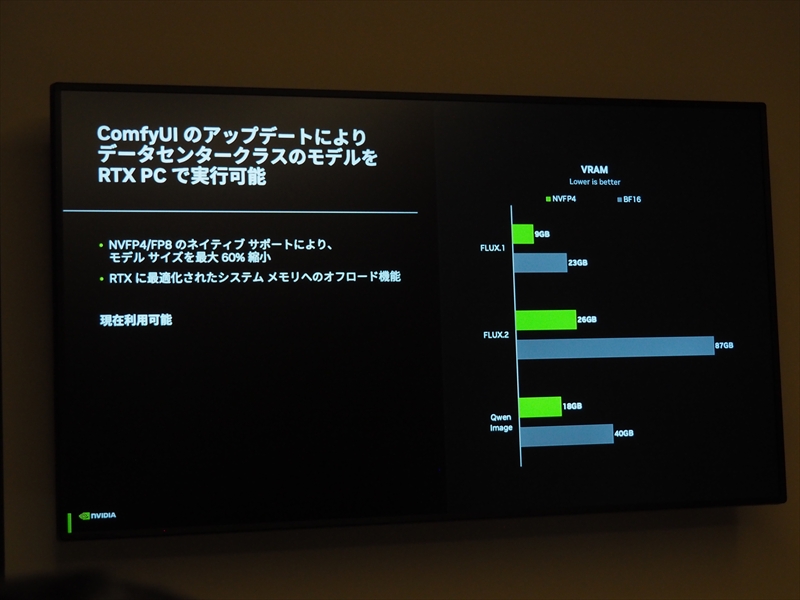 加えて、クリエイティブAI向けには、ComfyUIと共同で最適化を進めている。直近の四半期で性能を40%向上させ、コンテンツには4ビットの浮動小数点データフォーマットであるNVFP4、8ビットのNVFP8のネイティブサポートを追加している。