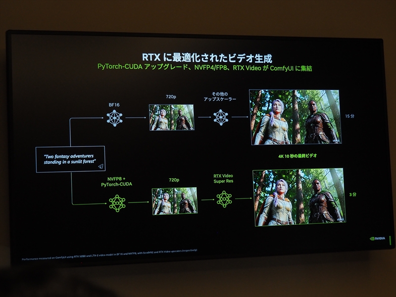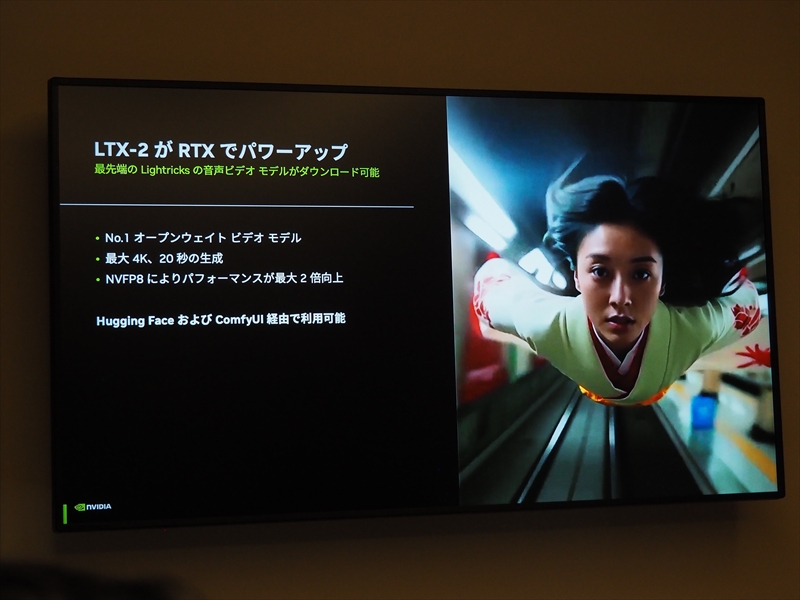 また、今年になって公開された音声を加えたビデオ生成の「LTX-2」というモデルもRTXに最適化されて登場し、大きな話題となり、人気になっているという。「LTX-2」は最大4Kの映像を50fps、あるいわ最長で20秒間のビデオを生成できる。