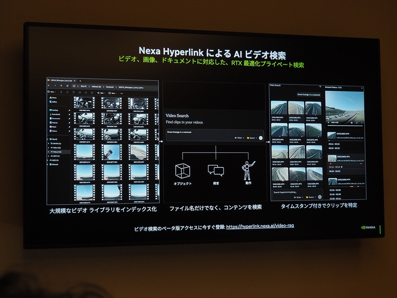 しかし、「Hyperlink」はストレージ内のインデックスを生成し、生成AIを用いて検索する。この検索作業がRTX GPUによって高速化される。CES2026では、この検索対象がドキュメント、文章、画像だけでなく、ビデオ(動画)も加わったと明らかになった。