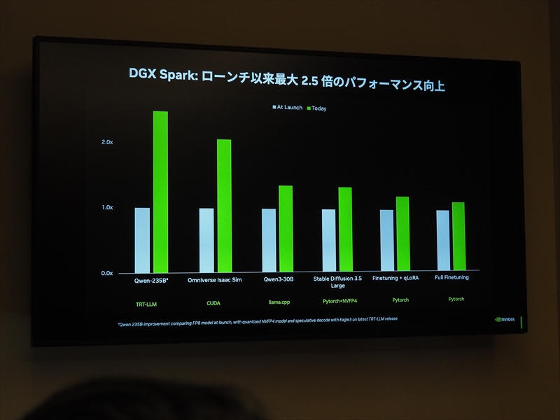 また、昨年10月に発表された超小型なスーパーコンピューター「NVIDIA DGX Spark」(以下、DGX Spark)のアップデートの紹介もあった。たとえば、大規模言語化モデル「Qwen3-235B」は、NVFP4の量子化サポート、TensorRT-LLM(大規模モデルを実行する推論エンジン)の最新版に搭載されているEagle3投機的デコーディングを採用することで、パフォーマンスを2.5倍に向上。