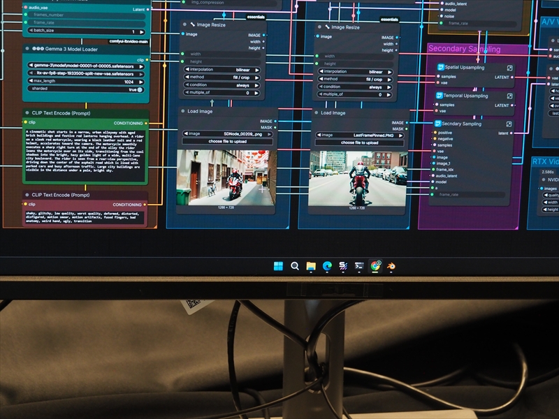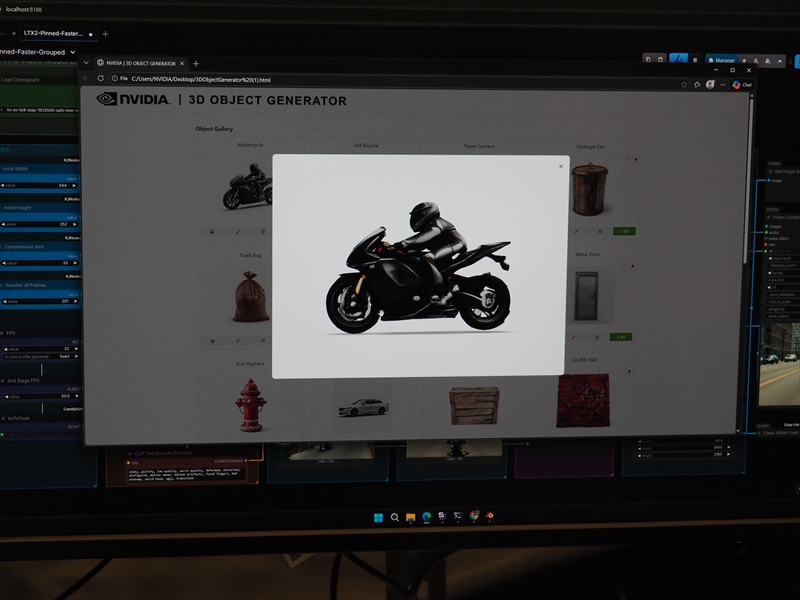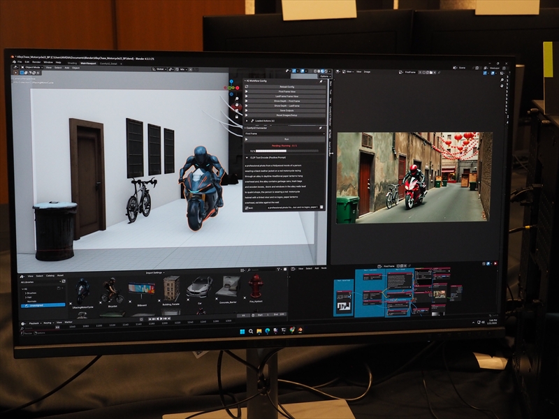 実施にデモでは、LTX-2を使ったビデオ生成が見れた。テキストから10数秒で3Dアセットがいくつか提示され、それを背景画像と合わせてシーンを作って、ビデオの最初と最後の画像をキーフレームとして指定。わずか数分でライダーがバイクに走らせ路地から大通りに出て走っていく映像が作られていた。