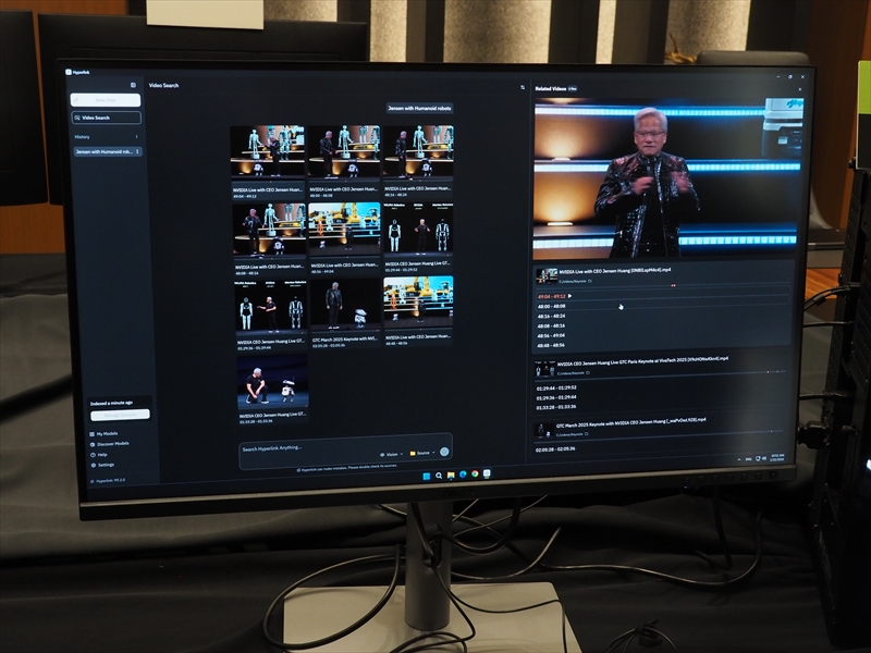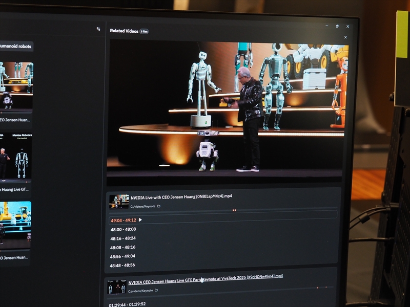 デモでは、NVIDIAのCEO ジェンスン・フアン氏と人型ロボットと検索。PC内にあるジェンスン・フアン氏が、ロボットと一緒にいる映像がいくつか検索されて表示された。記者からジェンスン・フアン氏は、有名人なのでネットに情報が出回っているが、それらを参照しているのか、といった質問が出たが、ローカルの情報のみで検索されているという。