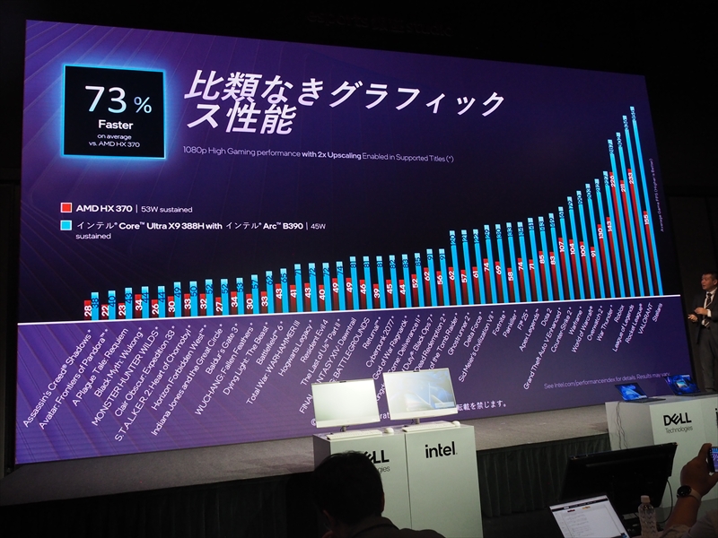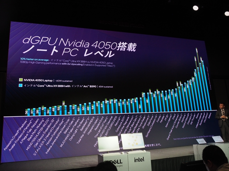 また、インテル株式会社 技術・営業統括本部 IA技術本部 部長 太田 仁彦氏が登壇し、Core Ultra シリーズ3プロセッサーについて、高いAI機能に加え、dGPU並みに性能向上した内蔵GPUをアピール。競合のiGPUや、ミドルローのdGPU並みの性能のノートPCでゲームが快適にプレイできるとアピールした。