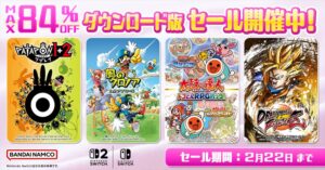 バンダイナムコエンターテインメントは、ニンテンドーeショップにて、ダウンロード版タイトルを対象とした期間限定セールを開催している。本セールでは、『パタポン1+2 リプレイ』や『ドラゴンボール ファイターズ』のほか、『風のクロノア 1&2アンコール』、『太鼓の達人 ドコどんRPGパック!』などの人気タイトルが、最大84%OFFの特別価格で購入できるとしている。