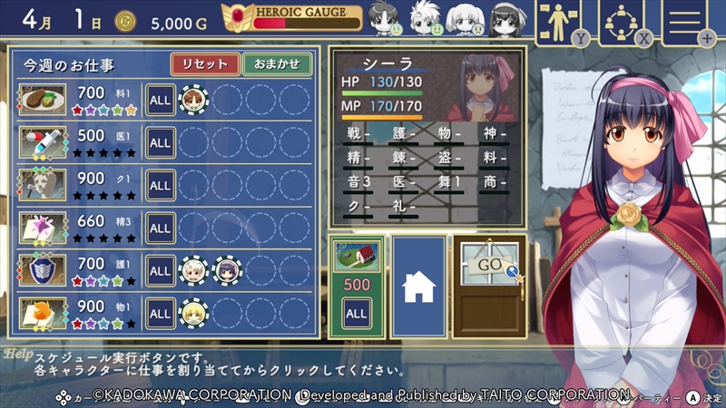 仲間への仕事の依頼は、キャラクターアイコンのチップをドラッグドロップして設定する。各仕事には仕事の属性、報酬額、必要なスキルレベルが記載されている。ALLをクリックすると、その仕事に全員を配置できる。ちなみに家のアイコンにキャラクターを配置すると休息させられる。