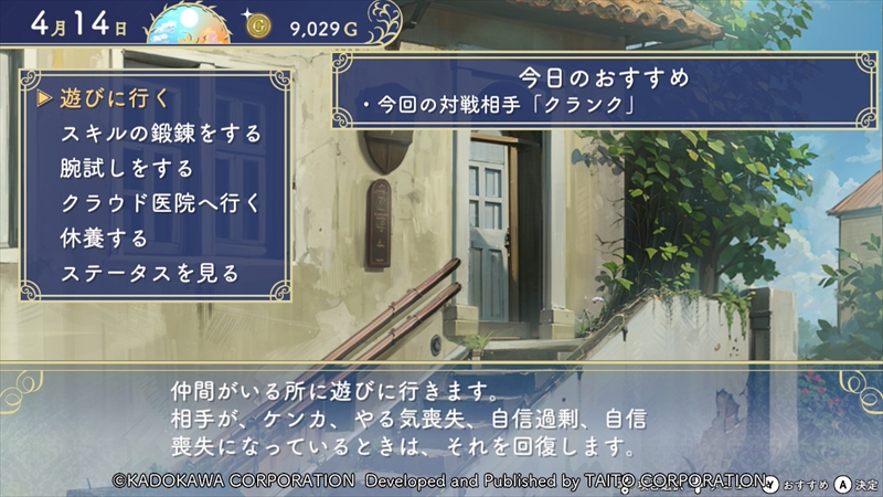 仕事はランダムなので、特定のスキルを任意で伸ばしたい場合は、「スキルの鍛錬をする」を選択肢、スキルを伸ばしたい仲間と一緒に任意のスキルの鍛錬を行うと良い。ただし、お金がかかるので残高には注意したい。