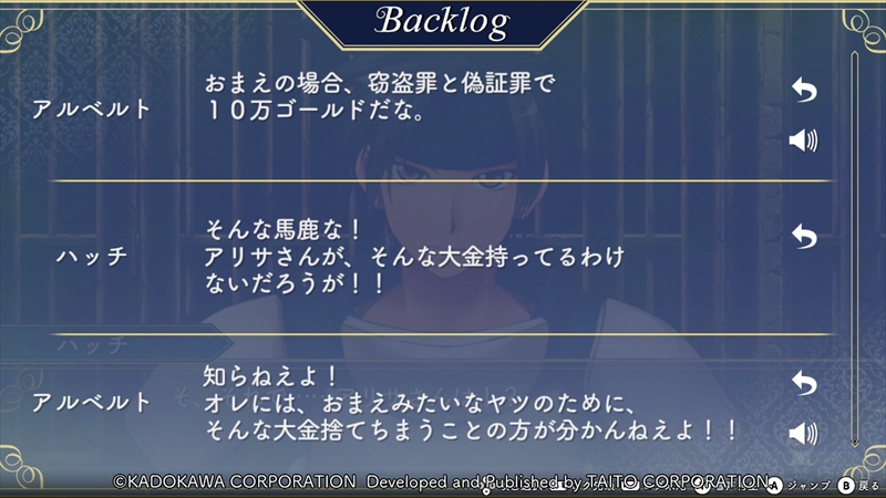 また、ログを出して前のセリフのところに戻る機能も搭載。やはりこの手のゲームは、明らかにNGな選択肢を選んで、キャラクターの反応が見たい!といった欲求もあると思うが、こうした機能があるため、ラクに前の選択肢・クイックセーブポイントに戻れるので、快適に隅々まで物語が楽しめる。