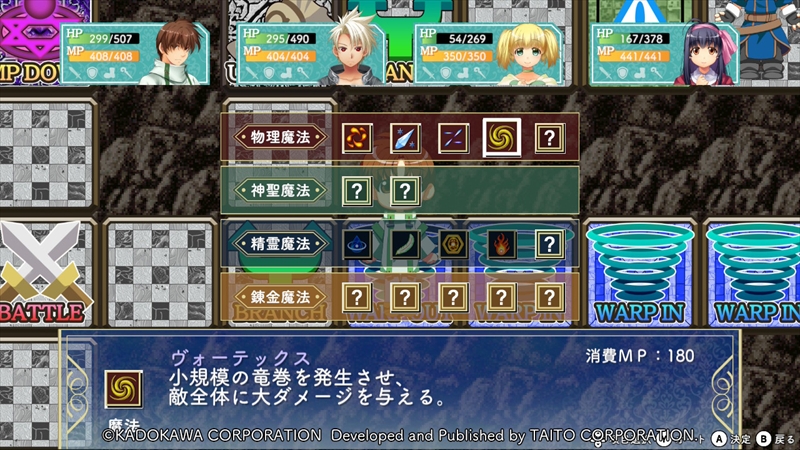 また、ルーレットを回す前であれば1回だけ魔法が使える。魔法を使って戦闘前に敵を攻撃したり、戦闘やマスの効果で体力が減っている場合は、回復も行なえる。