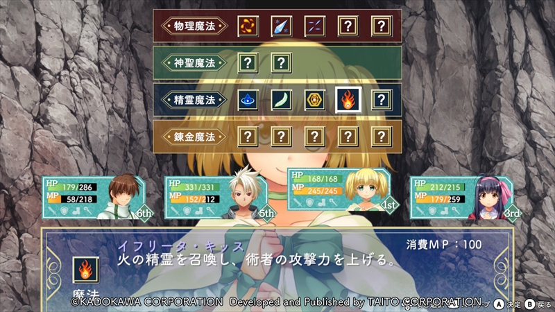 戦闘はターン制のコマンドバトル。自分の番になると攻撃や魔法、防御を選んで戦える。魔法は直接攻撃する物理魔法以外に、HPを回復する神聖魔法、防御力や攻撃力を上げるなどができる精霊魔法、罠を仕掛けて敵の体力を徐々に減らすなどの錬金魔法がある。