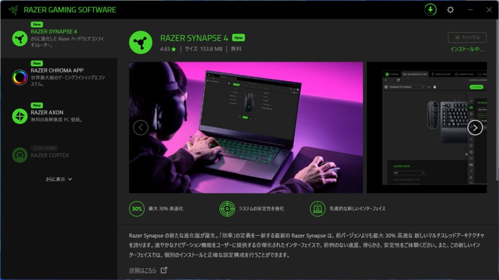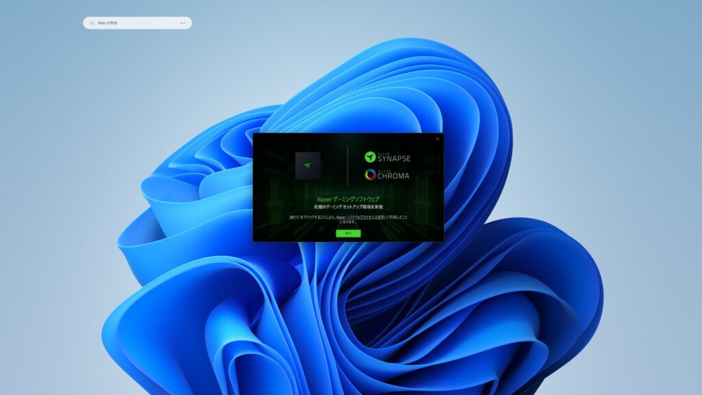 PCにきちんと認識されると、Razerのゲーミングソフトウェアをインストールするためのポップアップが表示されるため、「Razer Synapse 4」をインストールする。