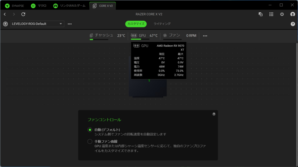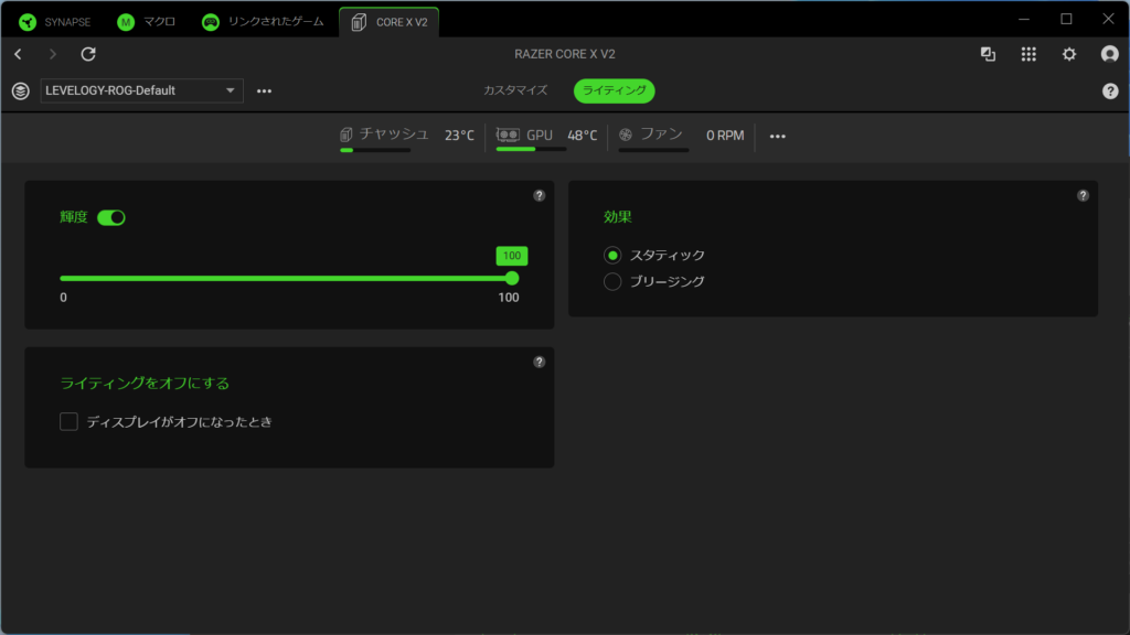 Razer Synapse 4では、ファンの速度やGPUの状態が確認できるほか、ファンコントロールを自動から手動に切り替えて、曲線にて調整できる。本体正面のロゴはLEDで光っているが、ライティングで輝度の調整、ディスプレイがオフの際にLEDを消すなどの設定が行なえる。