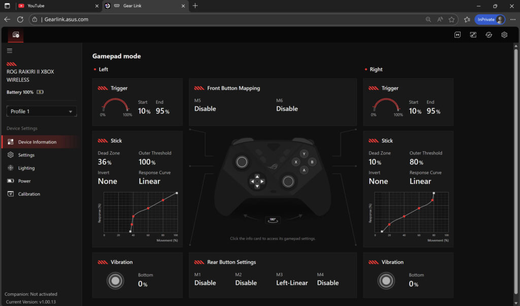 ゲームパッドのカスタマイズは、ウェブブラウザ上で動作するGear Linkで行なえる。ダウンロードやインストールが不要。ボタンの割り当てや変更、5種類のプロファイルの切り替え、振動強度やジョイスティックの応答カーブなどが変更できる。