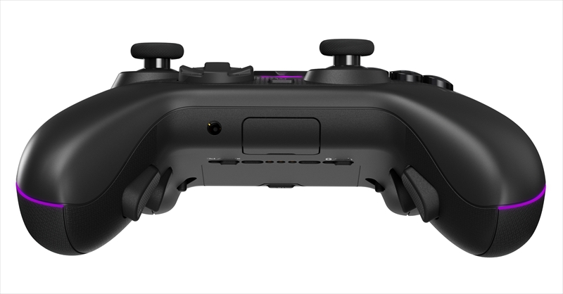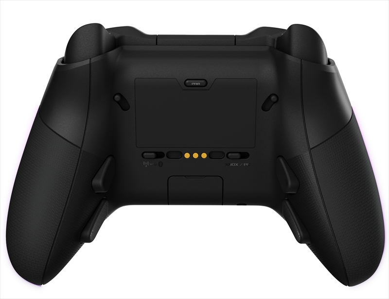 背面には通信モードの切り替えスイッチ、PCとXboxの接続切り替えスイッチのほか、トリガーの深さを変えられるスイッチを搭載。グリップの内側には、左右それぞれカスタマイズ可能なボタンを2つずつ備える。