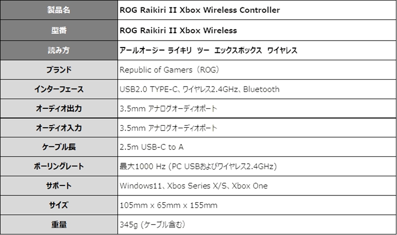 ASUS JAPANは、Xbox Series XおよびXbox Series Sの公式認証済みのゲーミングパット「ROG Raikiri II Xbox Wireless Controller」を発表した。2026年2月13日(金)より販売開始、価格は未発表。
