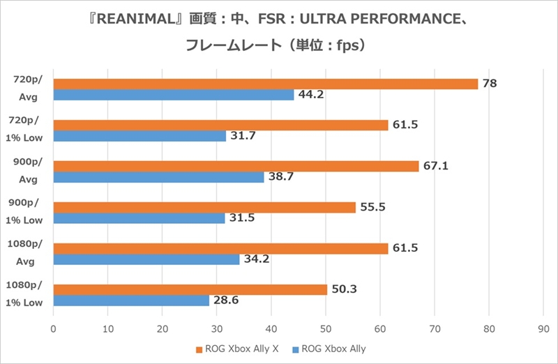 実際に720pまで落とすと、ROG Xbox Allyでも平均48.9fps、最小が24.1fpsとまずまず。たまに画面がカク付くことはあるが、体感的にも30fpsを超えた動作をしているので、シビアなアクションが求められない『REANIMAL』であれば、十分遊べると言えそうだ。