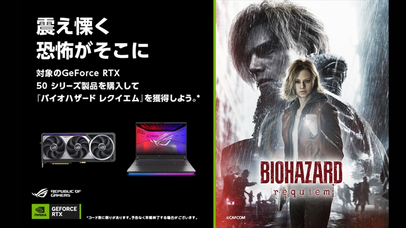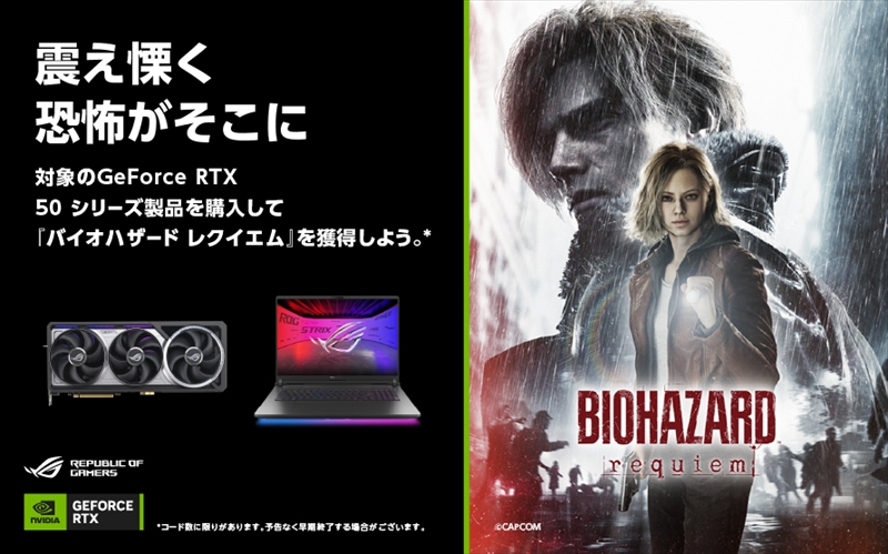 ASUS JAPANは、ASUSおよびROG製GeFoece RTX 5070以上のビデオカード単体をおよび、GeForce RTX 5070以上搭載のでストップPC、GeForce RTX 5070 Laptop GPU以上搭載のノートPCを購入すると『バイオハザード レクイエム』のゲームコードが貰えるキャンペーンを発表した。以下、リリースをまま抜粋。