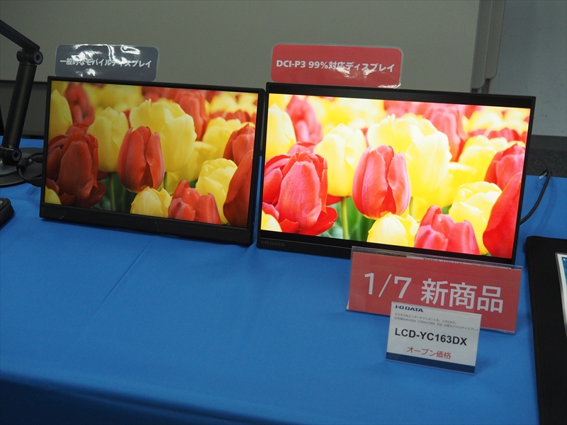 「LCD-YC163DX」は、発売済みの1920×1200ドットの16インチモバイルディスプレイ。解像度から分かるようにアスペクト比が16:10と、一般的な16:9よりもやや縦長。ビジネス向けのモバイルノートPCは、一時期から16:10の製品が増えているが、モバイルディスプレイとしては主流はまだ16:9で、ユーザーからの要望もあり本製品を開発するに至ったとのこと。