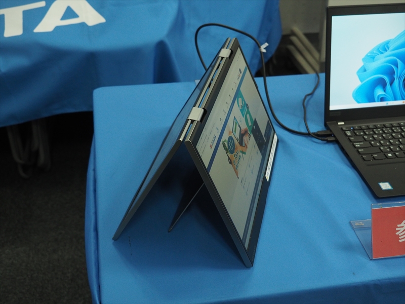 いわゆるYogaタイプの2 in 1ノートPCのようにヒンジ部分で折り曲げて、自分と対面の人に同じ画面を共有することも可能