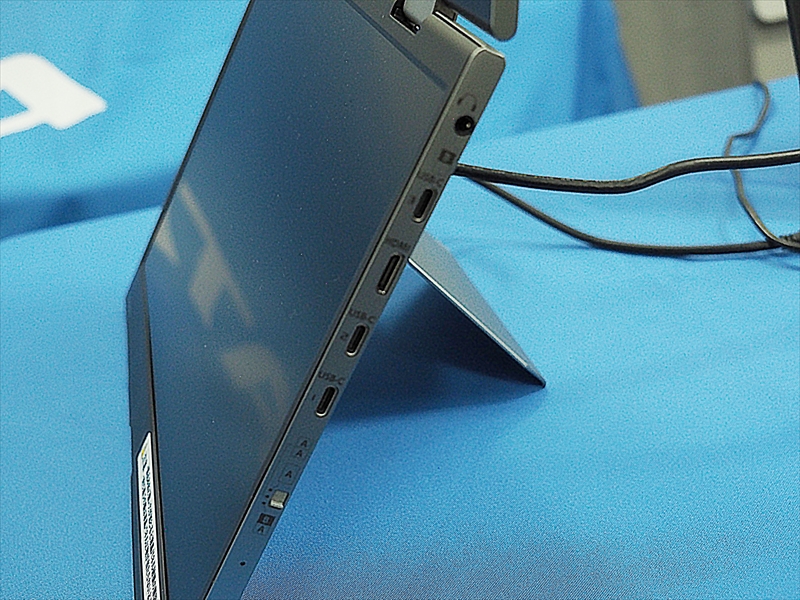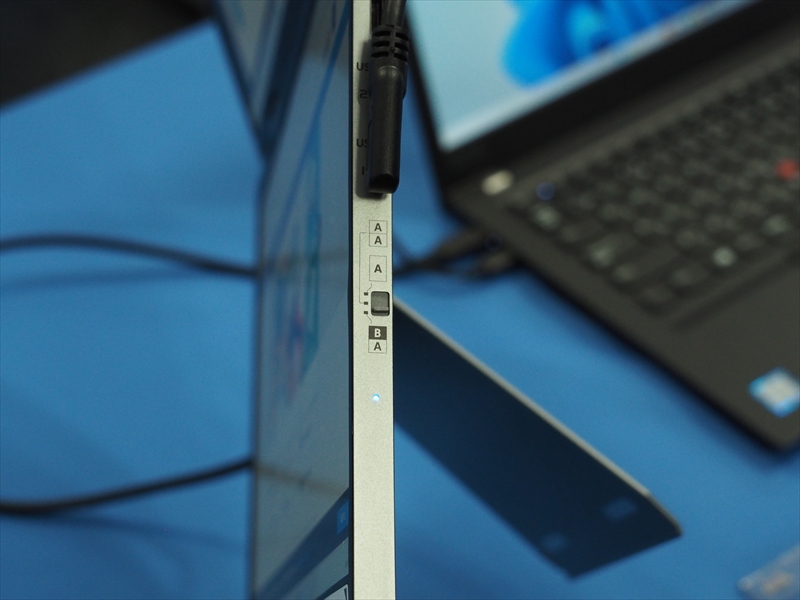 薄型な分、DisplayPort Alt Mode対応のUSB Type-C×2とインターフェースは少ないが、片側の側面に集約するのではなく左右に1ポートずつあり、ノートPCの右に置くか、左に置くかでPCとの接続ケーブルの位置を変えられるメリットがある。