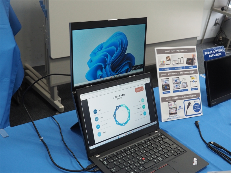 参考出展として展示されていた「LCD-YC1412DX」は、14インチ2画面のモバイルディスプレイ。ノートPCとUSB Type-Cケーブル1本で接続し、上下2画面、縦長の左右2画面、ヒンジ部分で折り曲げて山形にして対面の人に画面を共有する対面置きの3パターンで利用できると謳う。