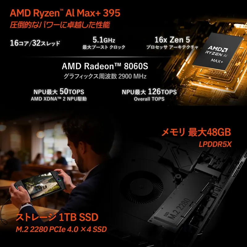 OneXFly APEXは、CPUにZen 5コアとRDNA 3.5 GPUを統合した「AMD Ryzen AI Max+ 395」を採用。統合グラフィックスの「AMD Radeon 8060S」は、40コアと従来のポータブルPC向けAPUと比較して大幅に演算ユニット数を増強。AAAゲームタイトルの高画質設定においても安定したフレームレートを実現する。また、50TOPSのNPU性能を備え、AI処理における電力効率も向上するとしている。