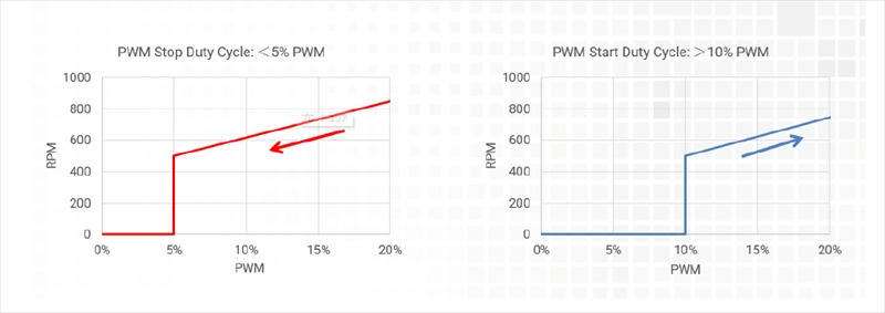 低PWM(~5%)時にはファンが0rpmで停止する「0 RPM スタート/ストップ」に対応。無音動作を実現すると同時に、省電力・環境配慮にも貢献し、デバイス寿命の延長にもつながるとしている。