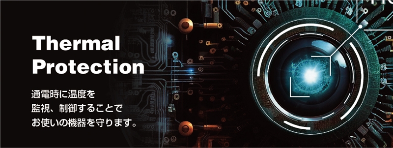 過充電・過放電・過電流防止機能および短絡保護機能と温度検知機能の5つの保護機能を備えた安心の回路設計。さらにThermal Protectionを搭載し、通電時に温度を監視・制御することで、使用する機器を守れるとのこと。