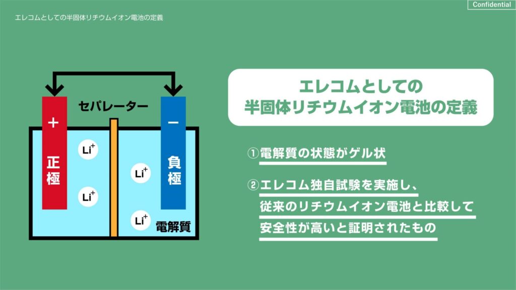 従来の一般的なリチウムイオン電池は、電池に含まれる電解液内でリチウムイオンが正極と負極の間を移動している。一方で、半固体電池は、液漏れのリスクを低減するため電解液をゲル化。発火事故の一因とされていた可燃性有機電解液の使用量を削減し、内部短絡(ショート)時の可燃性ガスの発生・放出を抑制することで、安全性を高めている。
