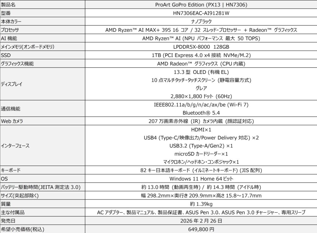 ASUS JAPANは、2026年2月25日に都内・某所にて行った「ASUS JAPAN 2026年新製品ノートPC メディア様向け発表会」にて、GoProとのコラボレーションモデル「ProArt GoPro EditionPX13 | HN7306EAC)」を2月26日に発売すると発表した。価格は64万9800円(税込)。