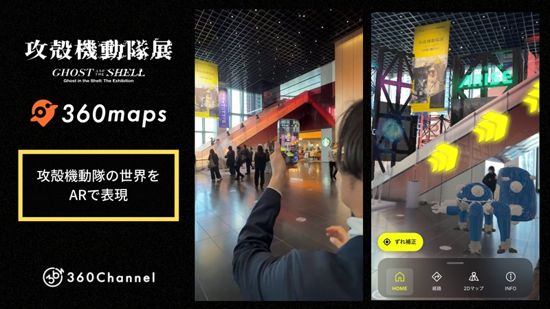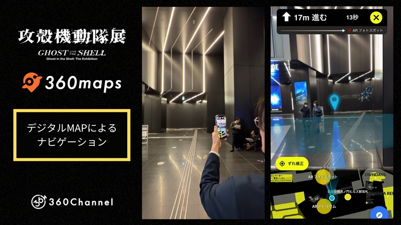 360mapsは、スマートフォンのアプリケーション上で動作するAR MAPシステム。ARで表現された攻殻機動隊の世界をはじめ、デジタルMAPによるナビゲーション、ARフォトスポットが主な特徴となっている。従来の2DマップとARナビゲーションを組み合わせた、次世代の道案内およびエンタメ体験が可能としている。