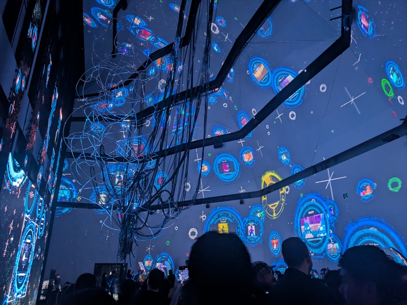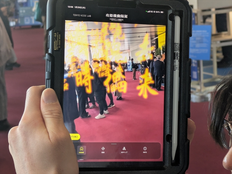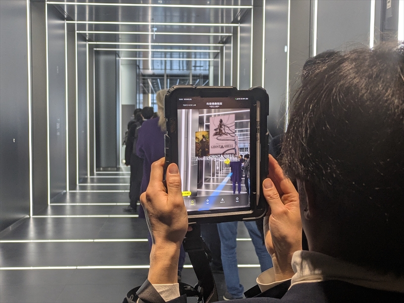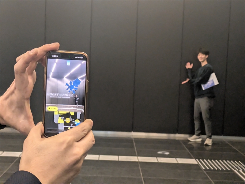 施設内の風景をスマホの画面に映してみると、3DのARルートや攻殻機動隊展の映像コンテンツがARで出現。作中に登場する「タチコマ」の3Dモデルが現実の空間に登場するなど、「攻殻機動隊」ファンを唸らせる演出が盛りだくさんだった。