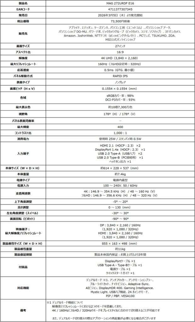 エムエスアイコンピュータージャパンは、2026年3月5日(木)よりデュアルモードを搭載したゲーミングディスプレイ「MAG 272URDF E16」を発売する。
