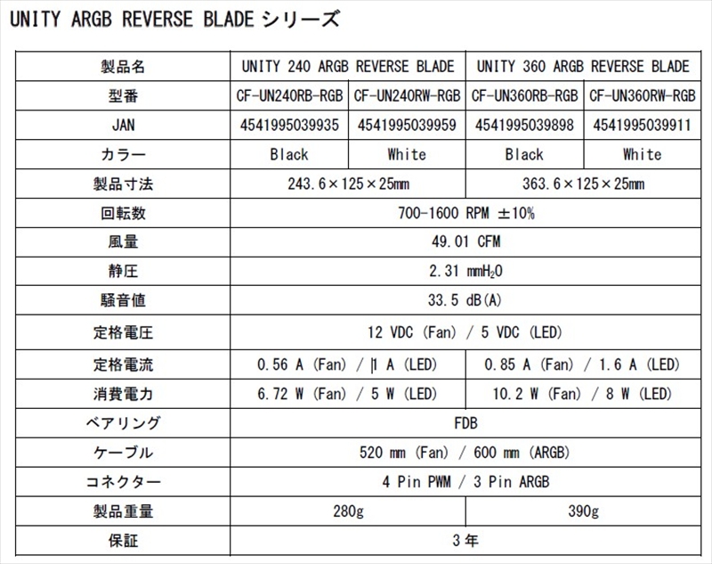 アユートWEB(UNITY 240 ARGB REVERSE BLADE):https://www.aiuto-jp.co.jp/products/product_6013.php
