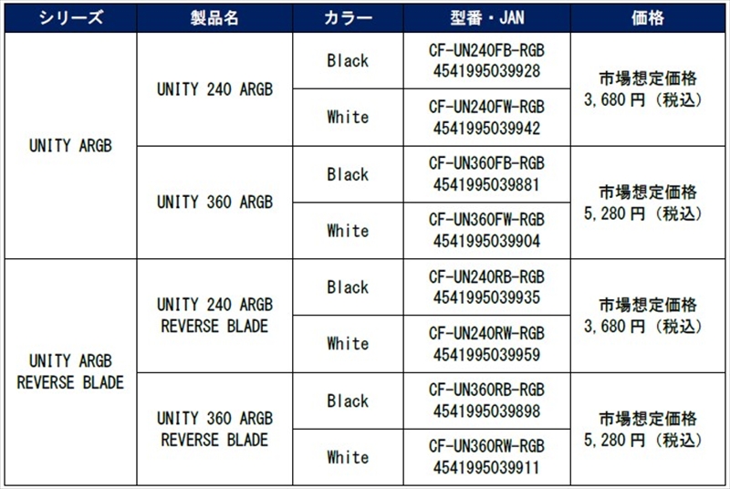 カラバリは黒と白2色で、通常モデルとリバースファンモデルの2種類でそれぞれ展開する。120mmのファン2つ、3つのモデルで価格が異なり、240mmのモデルは市場想定価格が3680円(税込)、360mmモデルが5280円(税込)となっている。