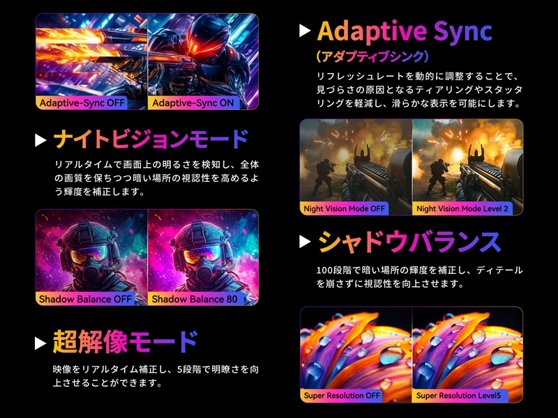 HDRのほか、カラーエンハンスメントやナイトビジョンモード、超解像モードなどの機能も備える。Adaptive Syncにも対応する。