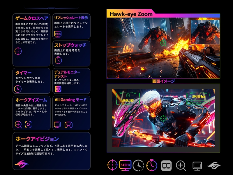 1152ゾーンのローカルディミングにより、光り漏れを抑制し、はっきりとした黒色を再現できるとしている。インターフェースはHDMI 2.1×2、DisplayPort 1.4×1、オーディオ出力ポートを備える。リフレッシュレートはHDMIとDisplayPortいずれも345Hzまで出力できる。