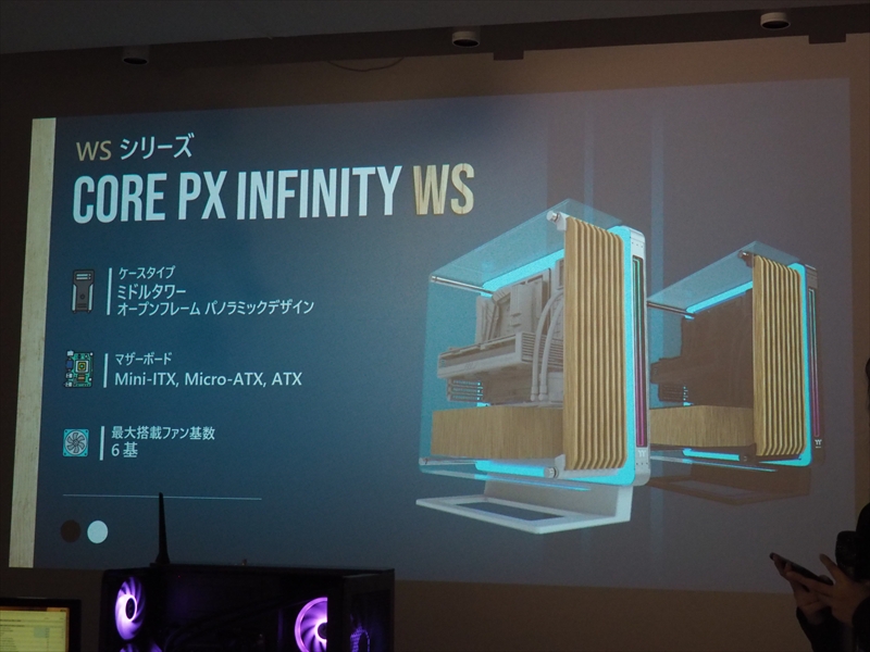 3年ぶりとなるCoreシリーズの新作「Core PX Infinity WS」は、CES 2026で展示されていたモデル。フロントなどに木材を採用し、インフィニティーミラーと、オープンフレームという3つの要素を組み合わせた製品となっている。背面コネクターのマザーボードにも対応し、最大420mmのラジエーターも搭載可能。また、縦置き、横置き、壁掛けの3つの置き方に対応するという。