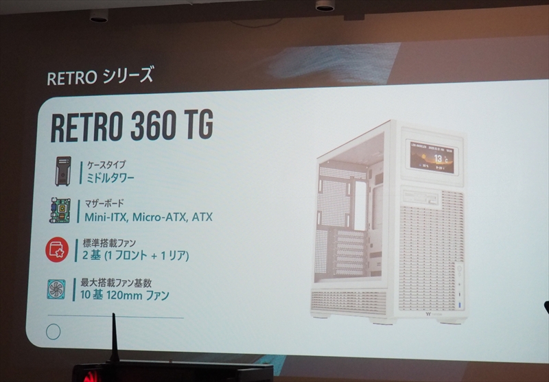 Retro 360 TGは、海外のイベントがきっかけで生まれたモデル。レトロゲームのエリアに、幅広い年齢層のユーザーが集まって楽しんでいるのを見て懐かしさを感じるケースデザインにしたという。ATXまでのマザーボードに対応し、最大360mmのラジエーターが搭載可能。